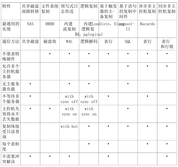 数据库在长期的运行中可能会遭遇到不同的故障场景,比如机房断电,网络中断,设备故障等等,数据库为了保障故障后业务数据不丢失,有很多成熟的解决方案,pg作为业界牛逼的开源数据库,提供了高可用、负载均衡和复制特性矩阵。