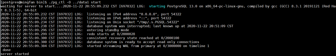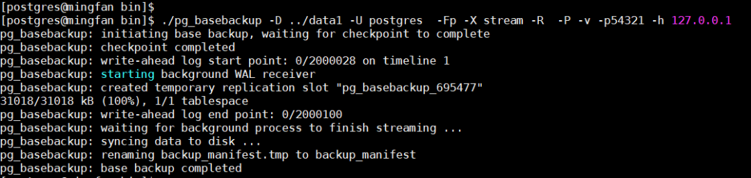./pg_basebackup -D ../data1 -U postgres -Fp -X stream -R -P -v -p54321 -h 127.0.0.1