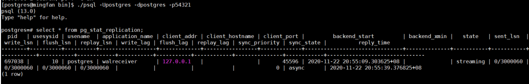 ./psql -Upostgres -dpostgres -p54321select * from pg_stat_replication;