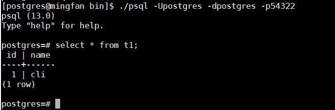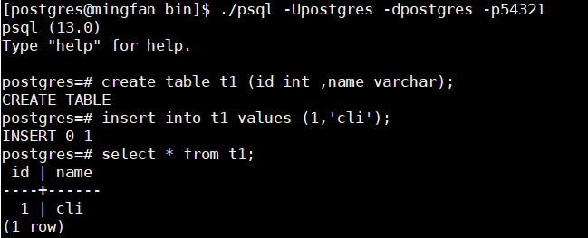 ./psql -Upostgres -dpostgres -p54321create table t1 (id int ,name varchar);insert into t1 values (1,'cli');