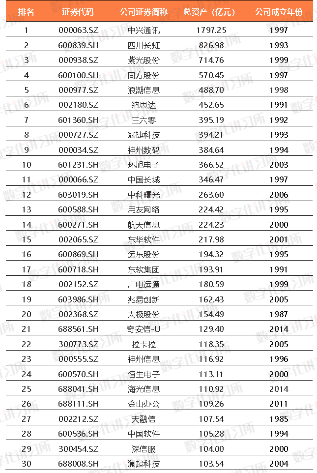 从下表可以看出,中兴通讯以1797.25亿元总资产规模排信创相关上市公司首位,除中兴通讯外,四川长虹、紫光股份以及同方股份总资产也在500亿元以上,规模较大。总资产规模在百亿元以上的30家信创上市公司,普遍成立时间较长,资产规模与公司存续时间有较强联系。规模最大的中兴通讯成立于1997年,其前身深圳市中兴半导体有限公司1985年成立,三十余年以来在核心网、承载、接入、5G无线、芯片等核心领域持续投入研发,目前已是全球领先的综合通信信息解决方案提供商,为全球电信运营商、政企客户和消费者提供创新的技术与产品解决方案。