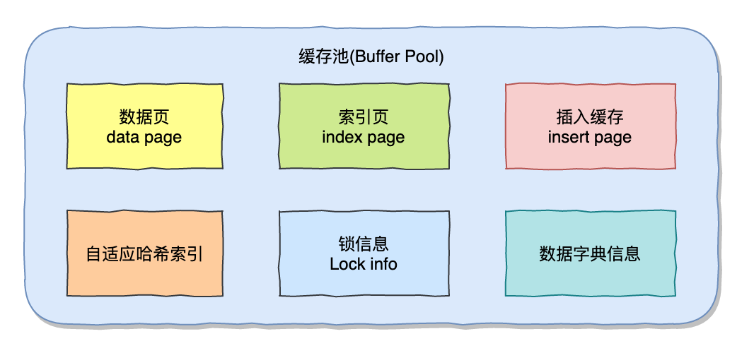 You can see that the cache pool includes data pages, index pages, insert cache, adaptive hash index, lock information, and data fields. The data page and index page will use up most of the memory.