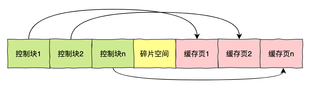 控制块和缓存页是一一对应的,它们都被存放到 Buffer Pool 中,其中控制块被存放到 Buffer Pool 的前边,缓存页被存放到 Buffer Pool 的后边。