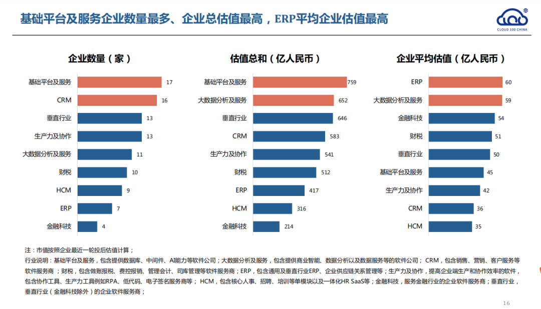 整体看,上榜企业总估值近 5000 亿元,企业估值中位数为 35 亿元,基础平台及服务企业数量最多、企业总估值最高 (759 亿人民币),ERP 赛道上榜企业的平均估值最高 (60 亿人民币)。