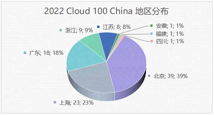 北京在该榜单上拔得头筹,有 39 家北京企业登录榜单,这与北京在数字科技产业上的发展水平是一致的。紧随其后的是上海,有 23 家企业上榜;然后是广东省 (18 家)、浙江省 (9 家)、江苏省 (8 家);安徽省、福建省和四川省各有 1 家上榜;其他省市无上榜企业。