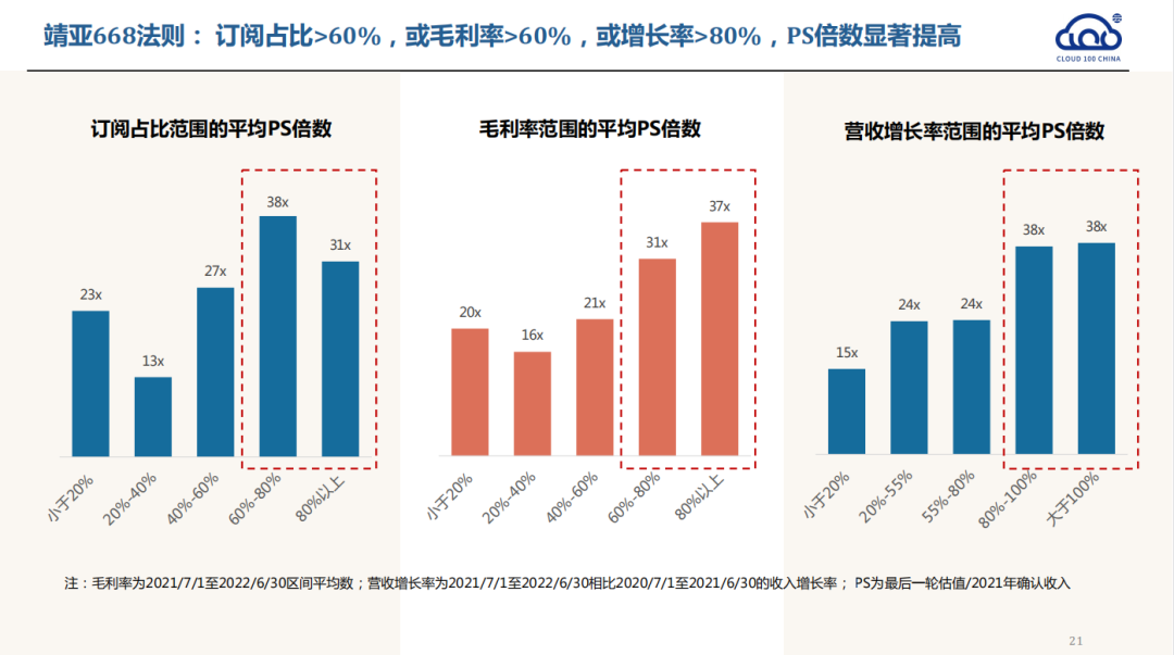 在上榜企业中,行业中位 PS 倍数为 20 倍,平均倍数为 34 倍,基础平台及服务等行业受极值影响 PS 平均值偏高。靖亚资本提出的“668 法则”认为,PS 倍数显著高于平均的企业,往往订阅占比超过 60%,或毛利率超过 60%,或增长率超过 80%。这一法则在榜单上得到了验证。