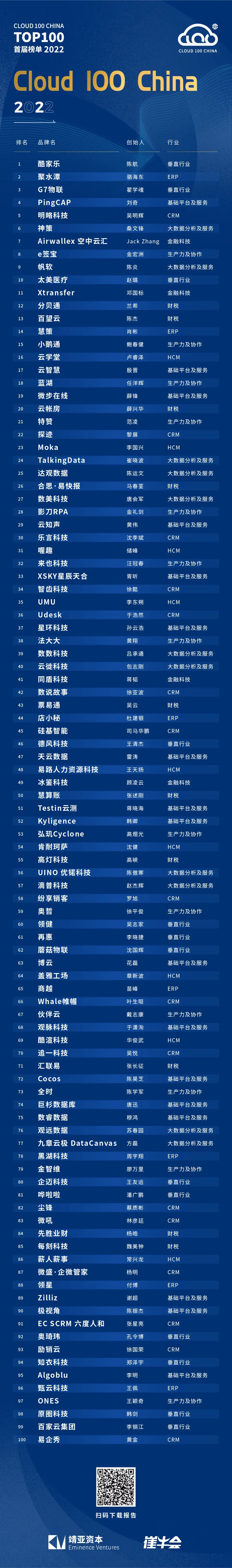 该系列榜单由靖亚资本和崔牛会联合推出,旨在关注中国最具潜力的 Cloud 公司,以企业的关键业务指标与专家评委打分,综合评选出中国排名前 100 的 Cloud 领域未上市创业公司,致力于增进行业深度交流,促进中国 Cloud 领域的生态构建和繁荣发展。