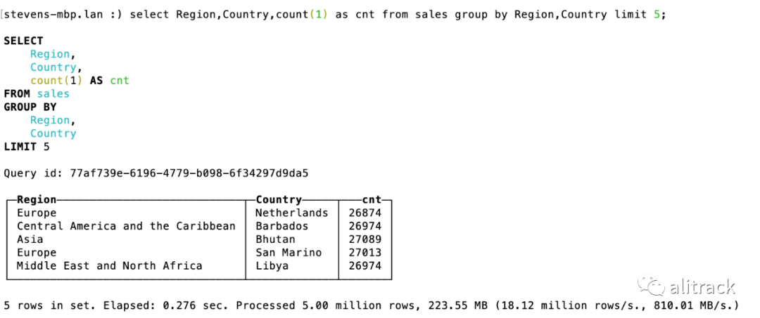 185 rows in set. Elapsed: 0.241 sec. Processed 5.00 million rows, 223.55 MB (20.73 million rows/s., 926.68 MB/s.)