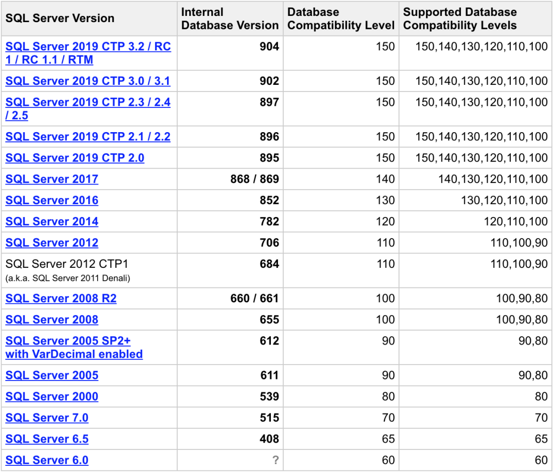 下图是服务器版本,内部数据库版本,数据库兼容级别以及数据库支持的兼容级别对照表,
