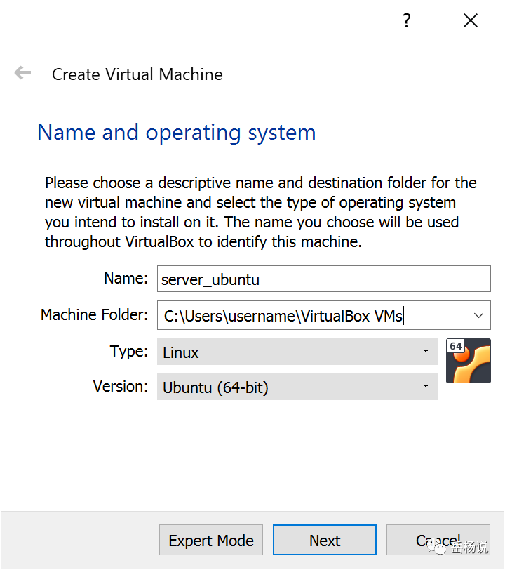 3.1. 运行VirtualBox,点击New,创建Virtual Machine。这里Name可以随意,如果包含Ubuntu, Type和Version一般会自动识别。如没有,可以手动填写。如下图: