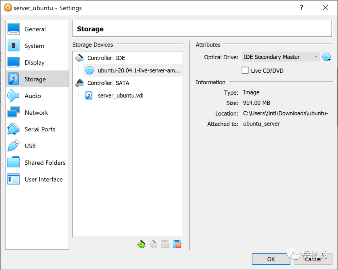然后到Storage->Controller: IDE: 选择镜像光盘,这里一开始是Empty,选中后在Attributes 点击光盘符号然后选中下载到Ubuntu server镜像文件,之后会看到信息在Information那里显示。