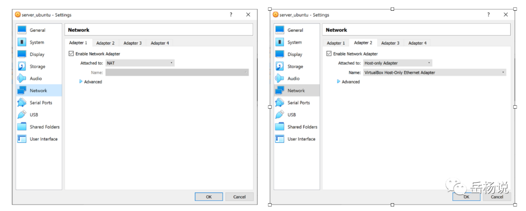 这里同时也可以对Network->Adapter 1/2做些设置。这里我们选择两个,一个Adapter Attached to: NAT, 另一个Adapter Attached to: Host-only Adapter。之所以选择两个,是因为我们想ssh方便的连接。如下图: