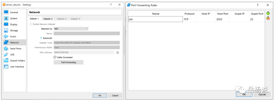 4.5. 设置Port Forwarding:现在回到Setting->Network->Adapter 1->Advanced-> Port Forwarding,来设置Virtual machine的Port Forwarding。之所以设置Port,就是保证在通信中转中,确保不会迷失。这里的Guest Port,对应的是Ubuntu server,要跟4.3.中的port一致。如下图。这里的Host Port对应的是Windows 10。如果后面设置外网ssh连接,这里要对应相应的router的Port forwarding设置,这个后面会提到。如果只是本地的ssh,比如,在windows 10上,ssh 到 ubuntu server,这里的port forwarding可以不需要,因为默认的是Guest Port就是22。在window 10,打开cmd窗口,运行ssh <username>@<ip address>就可以。比如,