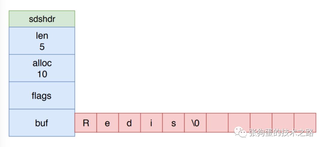 Redis 使用动态字符串 SDS 来表示字符串值。下图展示了一个值为 Redis 的 SDS结构 :