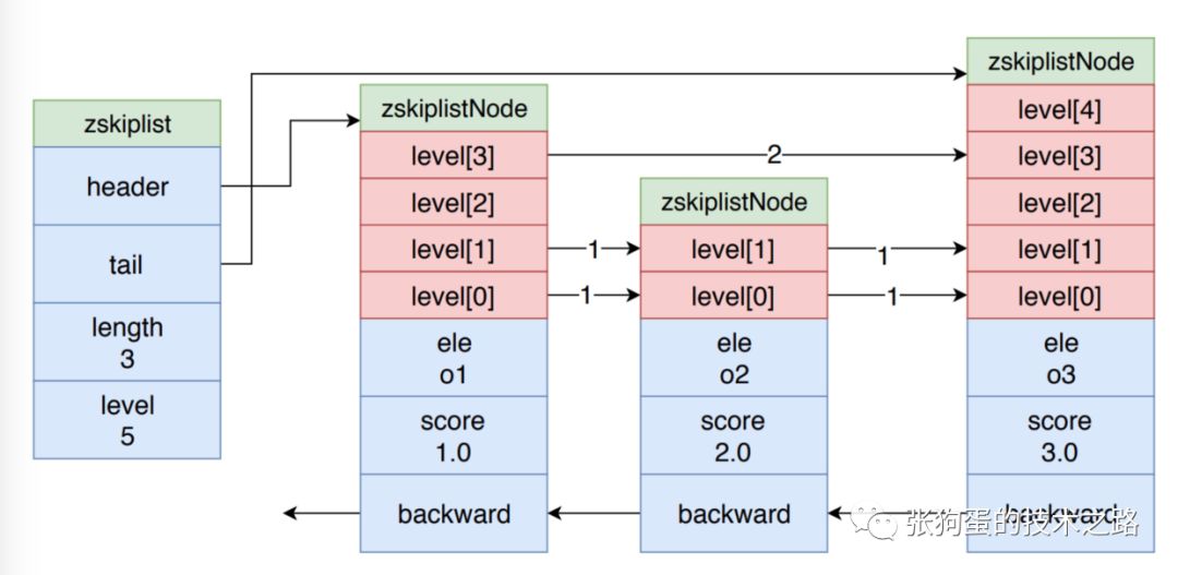 先从其 level[3] 开始查询,发现其跨度是 2,o1 节点的 score 是1.0,所以加起来为 3.0,大于 o2 的 score 值2.0。所以,我们可以知道 o2 节点在 o1 和 o3 节点之间。这时,就改用小刻度的尺子了。就用level[1]的指针,顺利找到 o2 节点。