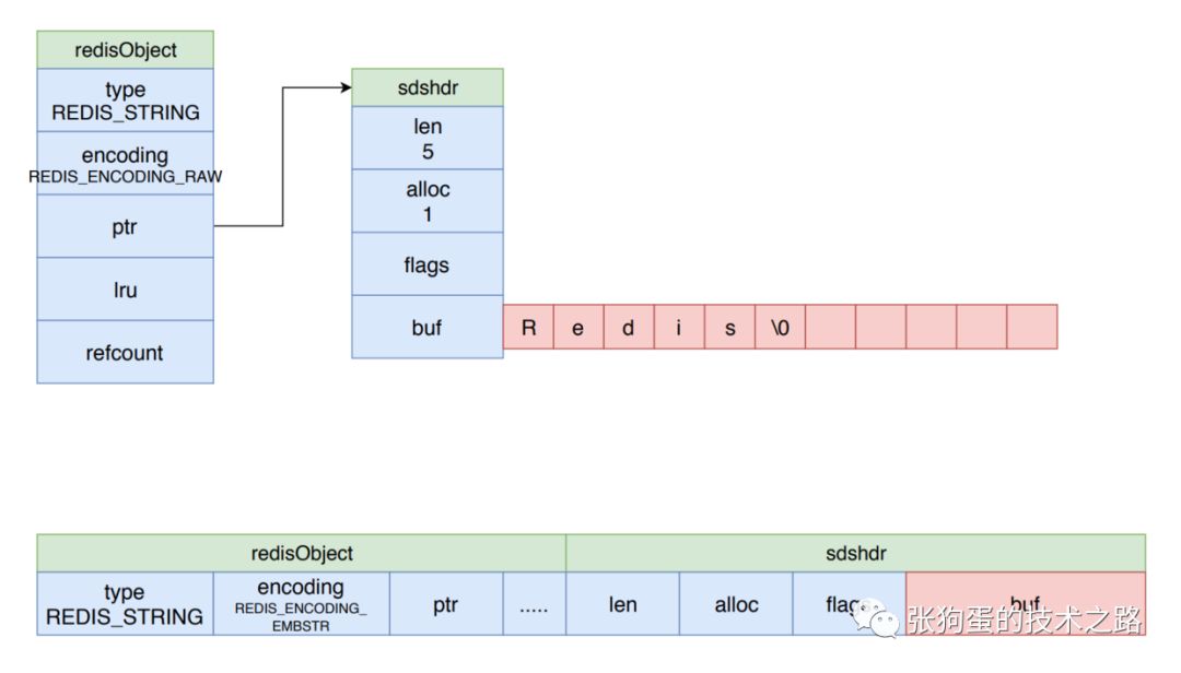 如果一个字符串对象保存的是一个字符串值,并且长度大于32字节,那么该字符串对象将使用 SDS 进行保存,并将对象的编码设置为 raw,如图的上半部分所示。如果字符串的长度小于32字节,那么字符串对象将使用embstr 编码方式来保存。