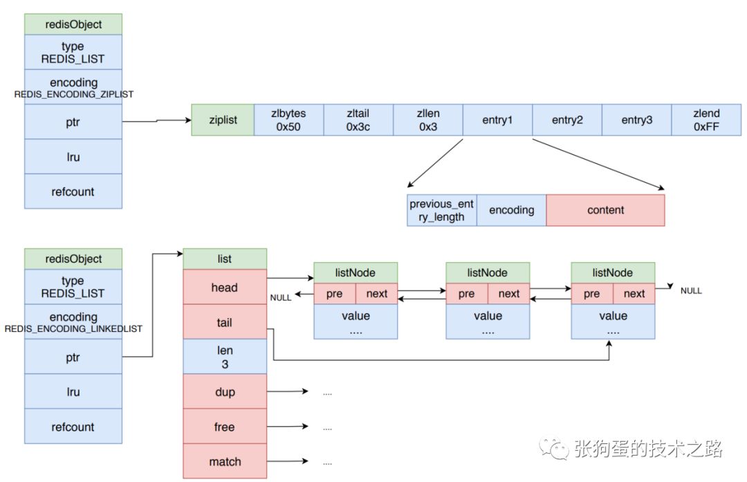 列表对象的编码可以是 ziplist 或 linkedlist。其示意图如下所示。