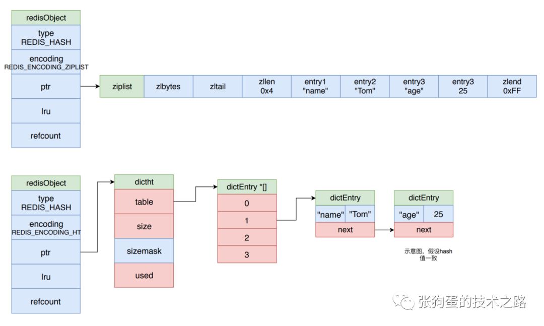 哈希对象的编码可以使用 ziplist 或 dict。其示意图如下所示。