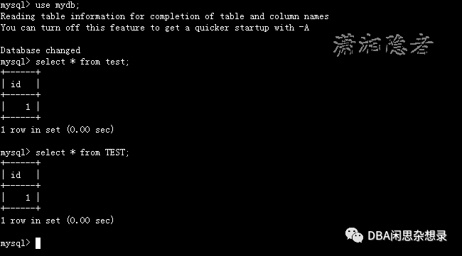 mysql> use mydb;Reading table information for completion of table and column namesYou can turn off this feature to get a quicker startup with -A Database changedmysql> select * from test;+------+| id |+------+| 1 |+------+1 row in set (0.00 sec) mysql> select * from TEST;+------+| id |+------+| 1 |+------+1 row in set (0.00 sec) mysql>