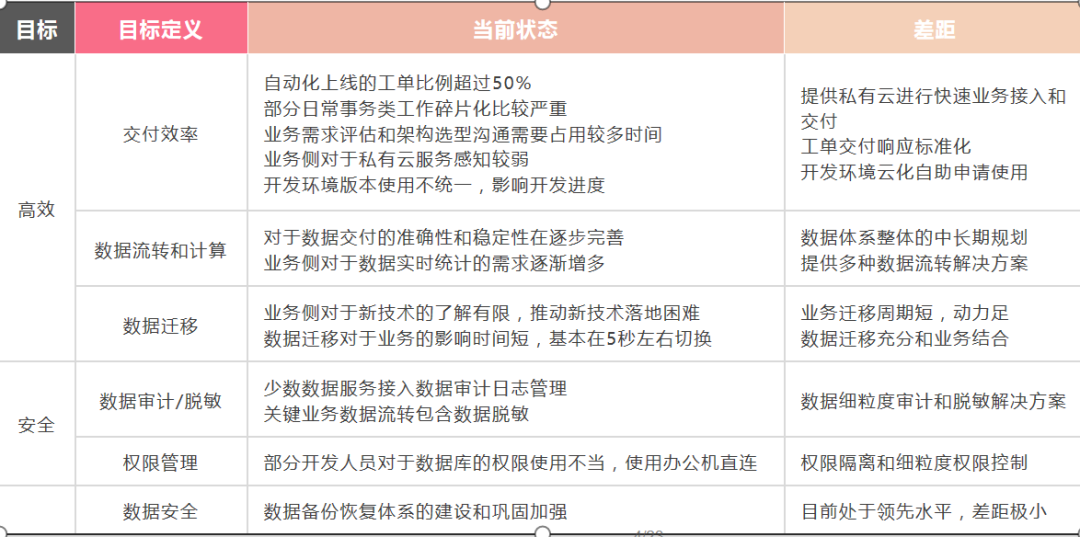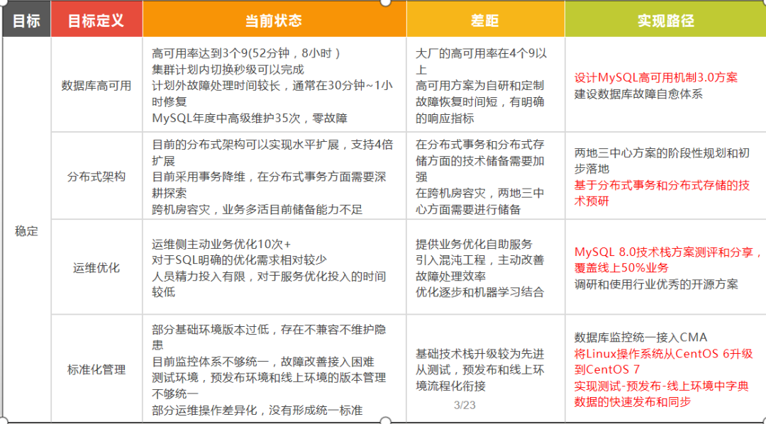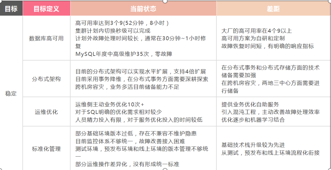 对于数据库侧的总体目标,我们达成了体系内的共识,那就是稳定,安全,高效,所有的工作都应该紧密围绕这三个维度来开展。