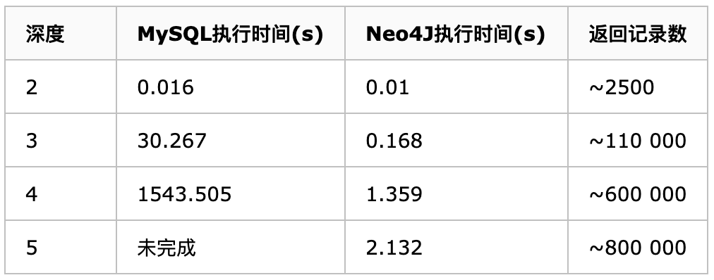 当查询的关系深度达到3时,MySQL的查询效率便开始被Neo4j图数据库甩开。