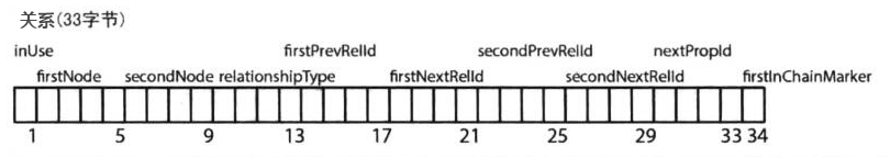 firstInChainMarker:表示该边记录是否是“关系链”中第1条记录假设要查询与某个点有对应关系的所有点时,首先查到该点的ID,通过该ID计算该点的存储偏移位置,从存储文件中获取到该点的信息,然后从该点的信息中获取到该点nextRelId数据即该点第一个关系的ID,根据这个ID计算该关系存储偏移量,从存储文件中获取该关系数据,判断是否为需要查询的关系,若为所要查询的,则获取该关系的secondNode即该关系的终节点ID,若为其他节点则保存该ID,查询到所有数据返回关系及节点。