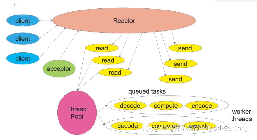 通常设置一个主线程负责做 event-loop 事件循环和 I/O 读写,通过 select/poll/epoll_wait 等系统调用监听 I/O 事件,业务逻辑提交给其他工作线程去做。而所谓『非阻塞 I/O』的核心思想是指避免阻塞在 read() 或者 write() 或者其他的 I/O 系统调用上,这样可以最大限度的复用 event-loop 线程,让一个线程能服务于多个 sockets。在 Reactor 模式中,I/O 线程只能阻塞在 I/O multiplexing 函数上(select/poll/epoll_wait)。