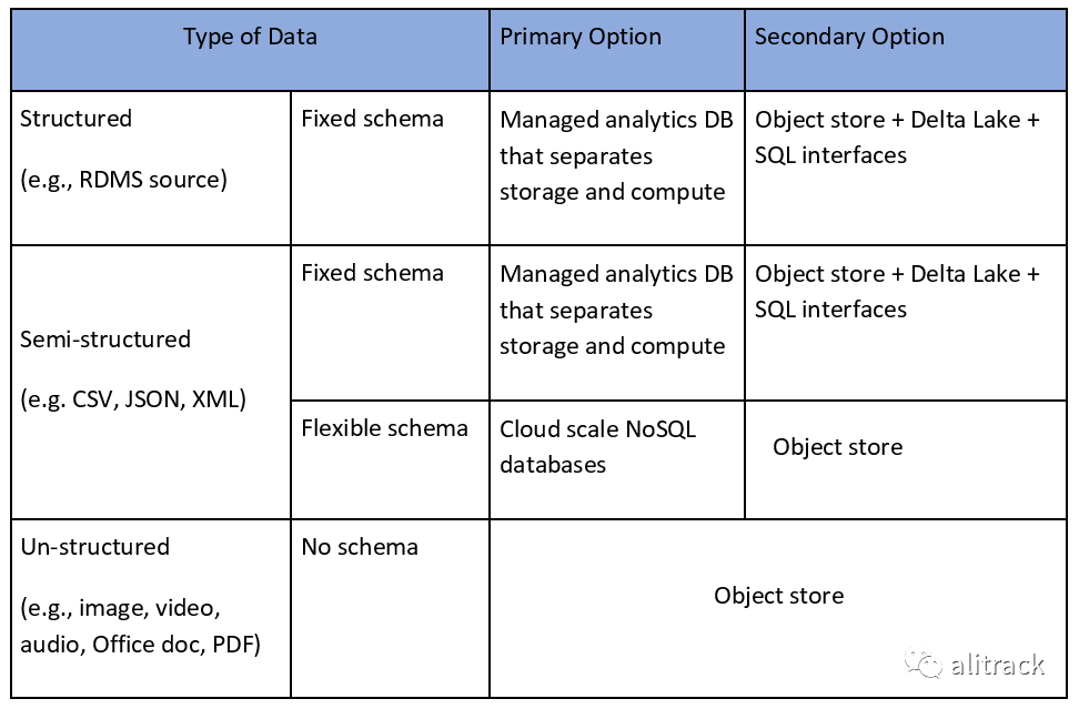 | 半结构化数据 | CSV,JSON,XML | 固定 | 计算存储分离的可维护分析数据库 | 对象存储+Delta+SQL 接口 |