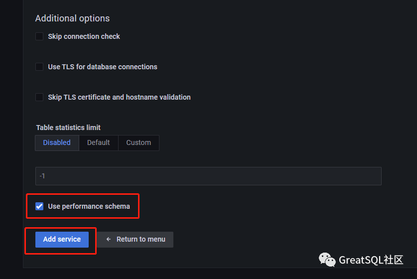 在添加监控之前,在MGR上创建用于监控数据采集的数据库的数据库用户,开启performance_schema的监控指标