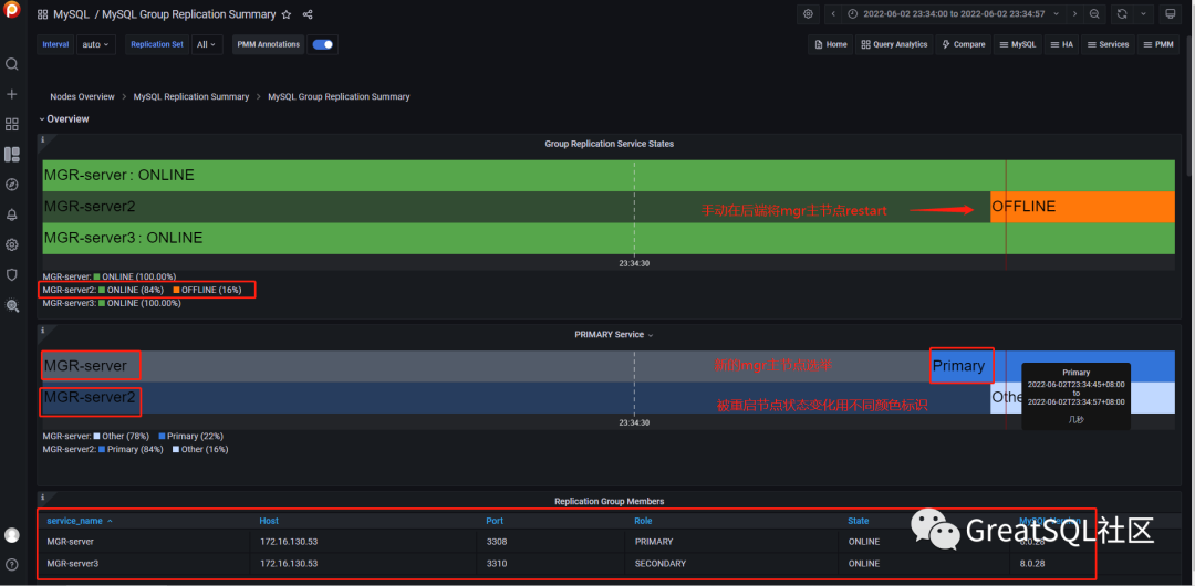 将上述剩余的两个MGR节点,以同样的方式添加到pmm-server,等待pmm-server的数据采集大约30s之后,就可以看到对应的MGR状态情况了,如下示例 监控MGR状态,采集所使用的SQL,我们可以在被监控的主机上尝试开启general log来捕获这些系统表的数据统计SQL。