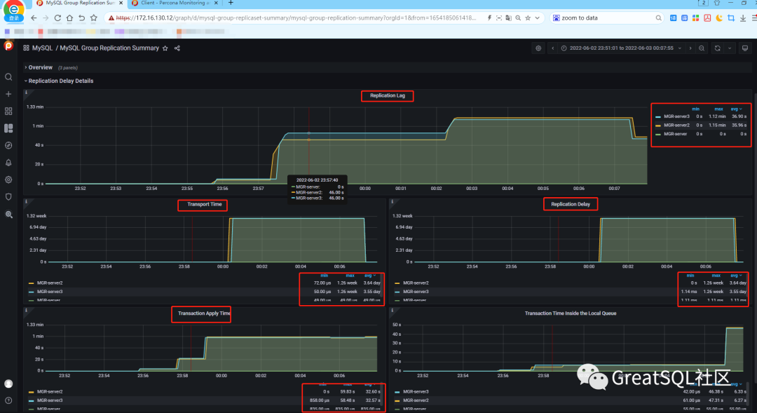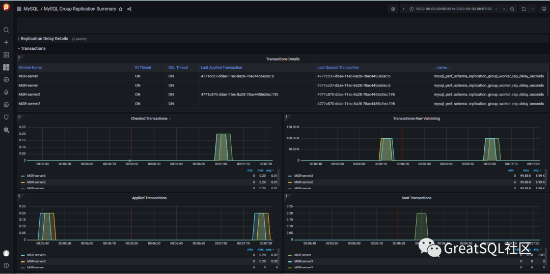 计算MGR节点延迟SQL,和事务执行情况,主要通过查询performance_schema.replication_connection_status表和 performance_schema.replication_applier_status_by_worker通过并行的channel做关联运算来获取MGR单住模式下,主节点和从节点的延迟的。LAST_APPLIED_TRANSACTION_END_APPLY_TIMESTAMP - LAST_APPLIED_TRANSACTION_ORIGINAL_COMMIT_TIMESTAMP