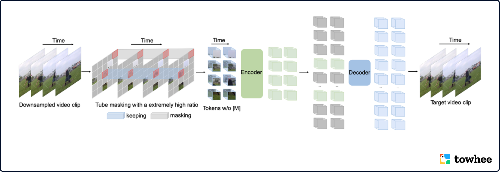 VideoMAE 的关键是与掩码相关的两个设计:极高的掩蔽率和tube掩蔽策略。相比于图像 MAE,视频数据在时空维度上存在更多的冗余。为了不让模型从高度相似的相邻帧学到重建的知识,模型使用非常高的遮盖率从视频中删除时间立方体。同时,这一操作也降低了编码器-解码器架构的预训练成本。为了降低重建过程中的信息泄露风险,模型采用了 tube 掩蔽策略加入时间的相关性。