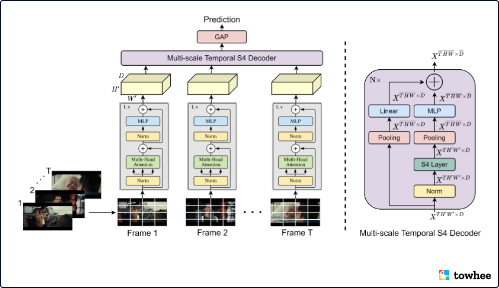已有的大多数视频模型都更适用于短视频,需要复杂的计算和长时间的推理才能完成长视频理解任务。最近引入的视频 Transformer 通过使用远程时间自注意力解决部分问题,然而这需要非常昂贵的成本二次运行注意力机制。Vis4mer 使用标准的 Transformer 编码器提取短距离时空特征,随后使用多尺度的时间 S4 解码器进行长距离的时空推理。逐步减少每层解码器的时空特征分辨率和通道维度,Vis4mer 能从视频中学习复杂的长距离时空依赖性。