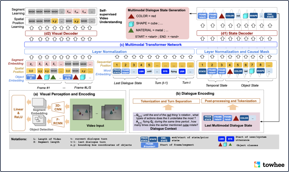 VTDN 结合物体级别和片段级别的特征,学习视频和对话之间的上下文依赖,从而生成多模态对话状态。该模型由4个核心部分构成:视觉感知和编码、对话编码、多模态 Transformer 网络、状态和视觉解码。视觉感知和编码器使用预训练好的 Faster R-CNN 提取视频帧中的物体特征,并使用 ResNeXt 模型提取视频片段级别的表征。对话编码器将对话文本进行编码,并且与传统对话状态追踪类似,将状态信息展开作为序列处理。然后视觉特征与对话特征一起经过多模态 Transformer 架构后,分别进行解码处理,最终生成多模态对话状态。