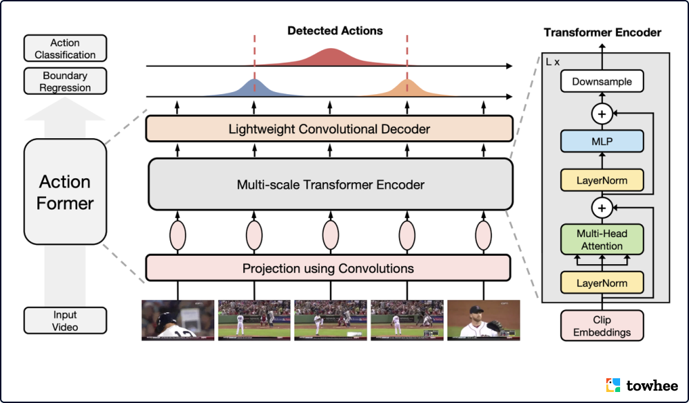 ActionFormer 的基本思想很简单,将长视频中的每一帧都当作 action candidate,然后做分类和回归任务。通过分类得到动作类别,回归得到和动作边界的距离。该模型架构主要由以下部分组成:用于特征提取的骨干网络、用于投影的浅层卷积、堆叠数层 Transformer 模块组成的编码器、利用卷积神经网络的解码器。
