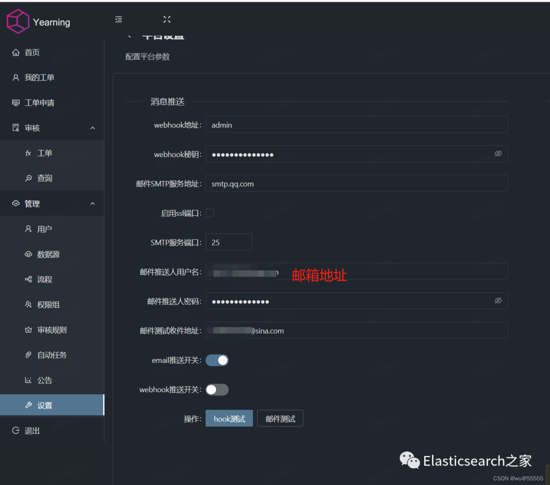 1、首先设置我们发送消息的邮箱,后续可以通过这个邮箱推送消息给指定的审核人,如果不需要邮件提醒可以跳过,当然也支持钉钉机器人消息提醒