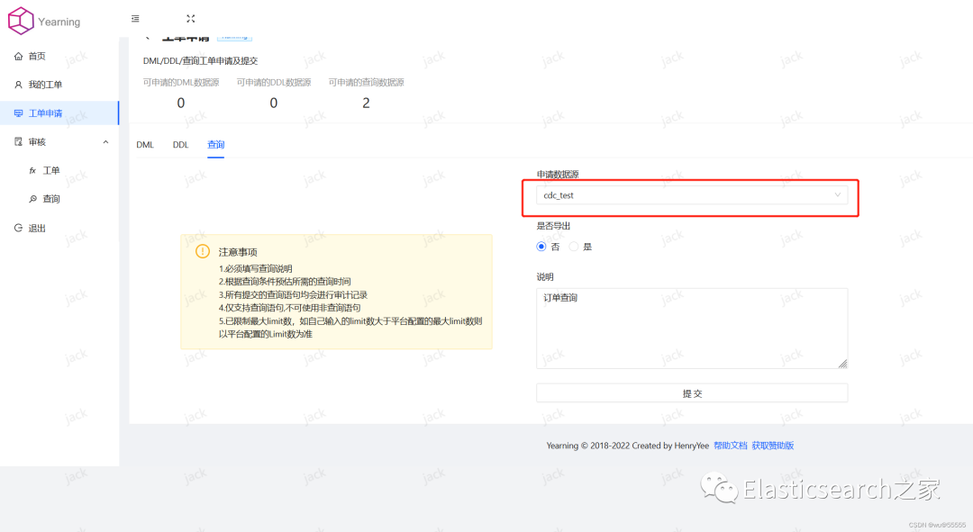 1、在工单申请中选择需要进行申请的操作,比如查询,选择需要查询的数据库,并且可以选择是否需要导出查询数据
