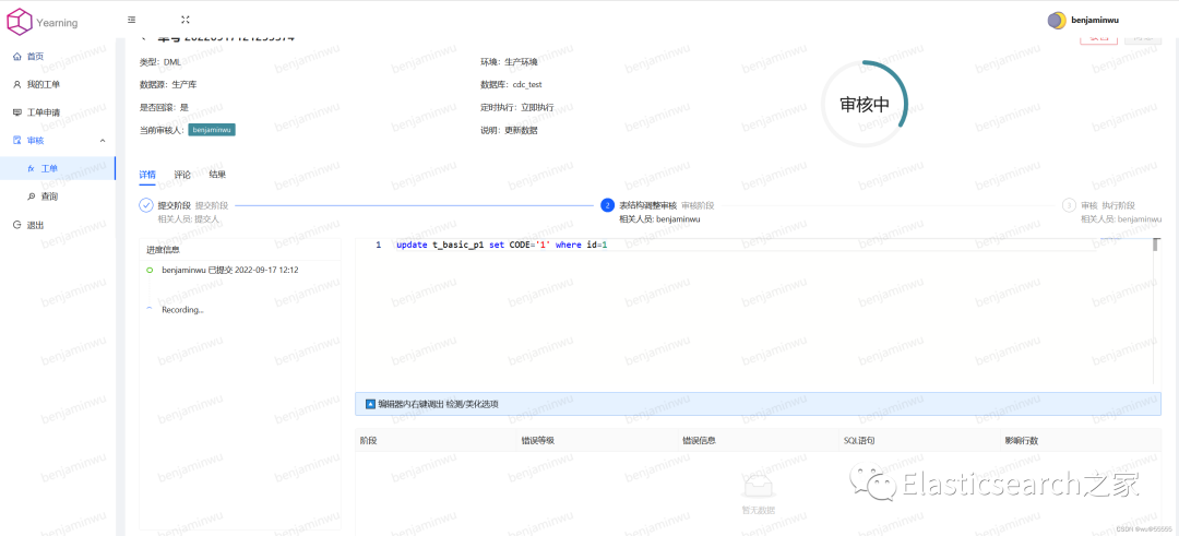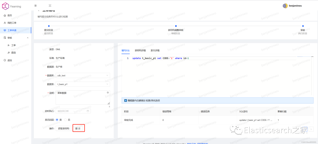 5、对于DDL,DML操作也类似,也先提交工单,只是提交的工单中就会书写要执行的SQL语句了