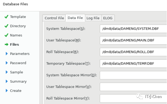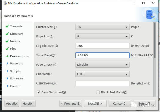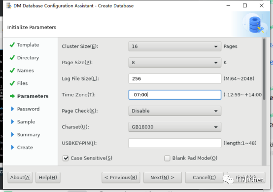 [dmdba@cjc-db-01 ~]$ dminit helpinitdb V8db version: 0x7000bfile dm.key not found, use default license!License will expire on 2022-10-01Format: ./dminit KEYWORD=valueExample: ./dminit PATH=/public/dmdb/dmData PAGE_SIZE=16Keyword Explanation(default value)--------------------------------------------------------------------------------INI_FILE dm.ini pathPATH database pathCTL_PATH control file pathLOG_PATH log file pathEXTENT_SIZE extent size of data file(16), optional value: 16, 32, 64, unit: PAGEPAGE_SIZE page size(8), optional value: 4, 8, 16, 32, unit: KLOG_SIZE log file size(256), unit: M, range: 64M ~ 2GCASE_SENSITIVE whether case is sensitive(Y), optional value: Y/N or 1/0CHARSET/UNICODE_FLAG CHARSET(0), optional value:0[GB18030],1[UTF-8],2[EUC-KR]SEC_PRIV_MODE security privilege mode(0), optional value£º0[TRADITION], 1[BMJ], 2[EVAL]LENGTH_IN_CHAR whether LENGTH for VARCHAR is in characters(N), optional value: Y/N, 1/0SYSDBA_PWD set SYSDBA password(SYSDBA)SYSAUDITOR_PWD set SYSAUDITOR password(SYSAUDITOR)DB_NAME database name(DAMENG)INSTANCE_NAME instance name(DMSERVER)PORT_NUM listener port(5236)BUFFER System buffer size(100), unit: MTIME_ZONE set time zone(+08:00)PAGE_CHECK page check mode(0), optional value: 0/1/2EXTERNAL_CIPHER_NAME set default encrypt/decrypt algorithmEXTERNAL_HASH_NAME set default hash algorithmEXTERNAL_CRYPTO_NAME set crypto name to encrypt svr keyRLOG_ENC_FLAG whether encrypt redo log(N), optional value: Y/N, 1/0USBKEY_PIN set usbkey pinPAGE_ENC_SLICE_SIZE slice size for page encryption, optional value: 512, 4096, unit: ByteENCRYPT_NAME set algorithm for encrypt the whole databaseBLANK_PAD_MODE set blank padding mode(0), optional value:0/1SYSTEM_MIRROR_PATH mirror path of system data fileMAIN_MIRROR_PATH mirror path of main fileROLL_MIRROR_PATH mirror path of roll fileMAL_FLAG MAL_INI flag(0) in dm.iniARCH_FLAG ARCH_INI(0) flag in dm.iniMPP_FLAG MPP_INI(0) flag in dm.iniCONTROL control file path!AUTO_OVERWRITE whether overwrite all files with the same name(0) 0: no 1: part 2: allUSE_NEW_HASH whether use new hash algorithm for string. (default 1)DCP_MODE whether is DM CLUSTER PROXY mode(default 0)DCP_PORT_NUM in DCP mode, set dcp_port_numELOG_PATH set the path of log file recording the contents during initializationAP_PORT_NUM in ECS mode, AP listener port for cooperative workDFS_FLAG DFS_INI flag(0) in dm.iniDFS_PATH default path of db file when dfs_flag is trueDFS_HOST ip of ddfs(localhost)DFS_PORT port number of ddfs(3332)DFS_COPY_NUM copy num of dfs file(3)DFS_DB_NAME database name in ddfs(default same as DB_NAME)SHARE_FLAG database share flag in ddfs(default 0)REGION_MODE system tablespace datafile region policy in ddfs(default 0) 0: MICRO 1: GREATHUGE_WITH_DELTA Only support to create with delta huge table(default 1) 1: YES 0: NORLOG_GEN_FOR_HUGE whether to generate redo log for with delta huge table(default 0) 1: YES 0: NOPSEG_MGR_FLAG Only use manager segment to record trx info(default 0) 1: YES 0: NOHELP print help information