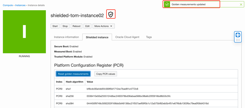 当使用Linux 7.x创建受保护实例后,重新启动时,PCR值可能会更改,从而导致出现红色盾牌,可通过过重置黄金测量值来解决。