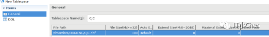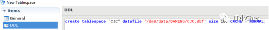 SQL> create tablespace chen datafile '/dm8/data/DAMENG/chen.dbf' size 32;executed successfullyused time: 30.891(ms). Execute id is 607.