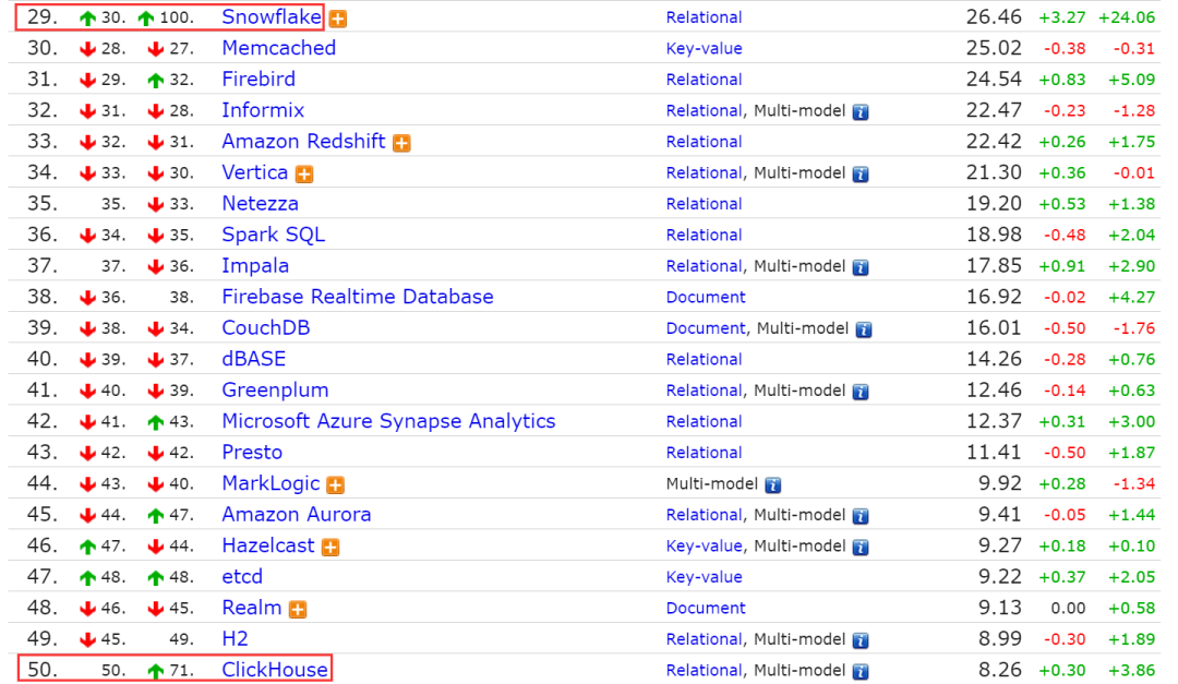 对于排名 20 之后的数据库,以年为维度,排名显著上升的数据库有 Snowflake 和 Clickhouse,Snowflake 由去年同时期的第 100 名上升到现在的第 29 名,后者也从第 71 名上升至第 50 名。两者都属于云数据仓库,Snowflake 的母公司去年上市后更是获得巴菲特青睐,股价飙升。相信这也是它排名上升的主要原因。