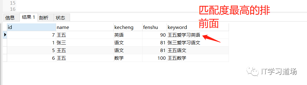 DROP TABLE IF EXISTS `t_stu`;CREATE TABLE `t_stu` (`id` int(10) unsigned NOT NULL AUTO_INCREMENT,`name` varchar(255) DEFAULT NULL,`kecheng` varchar(255) DEFAULT NULL,`fenshu` int(11) DEFAULT NULL,`keyword` varchar(255) DEFAULT NULL,PRIMARY KEY (`id`) USING BTREE) ENGINE=InnoDB DEFAULT CHARSET=utf8mb4 ROW_FORMAT=DYNAMIC;INSERT INTO `t_stu` VALUES (1, '张三', '语文', 81, '张三语文');INSERT INTO `t_stu` VALUES (2, '张三', '数学', 75, '张三数学');INSERT INTO `t_stu` VALUES (3, '李四', '语文', 76, '李四语文');INSERT INTO `t_stu` VALUES (4, '李四', '数学', 90, '李四数学');INSERT INTO `t_stu` VALUES (5, '王五', '语文', 81, '王五语文');INSERT INTO `t_stu` VALUES (6, '王五', '数学', 100, '王五数学');INSERT INTO `t_stu` VALUES (7, '王五', '英语', 90, '王五英语');-- create index方式创建CREATE FULLTEXT INDEX ft_index ON t_stu (keyword) WITH PARSER ngram;