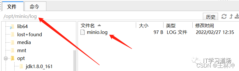 > opt/minio/log/minio.log 2>&1 & 日志输出地址