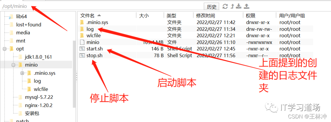 在/opt/minio文件夹下创建启动和停止脚本,和minio文件同级目录最好,方便管理