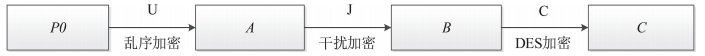 整个加密过程需经过 3 次加密,分别以 U,J,D 表示,每次加密后的密文分别以 A ,B ,C 表示。图 1 说明了 3 次加密之间的输入 输出关系。