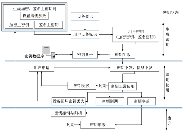 密钥全生命周期管理根据密钥的状态划分为密钥生成阶段、密钥正在使用阶段和密钥废弃阶段,主要包括以下几个过程: