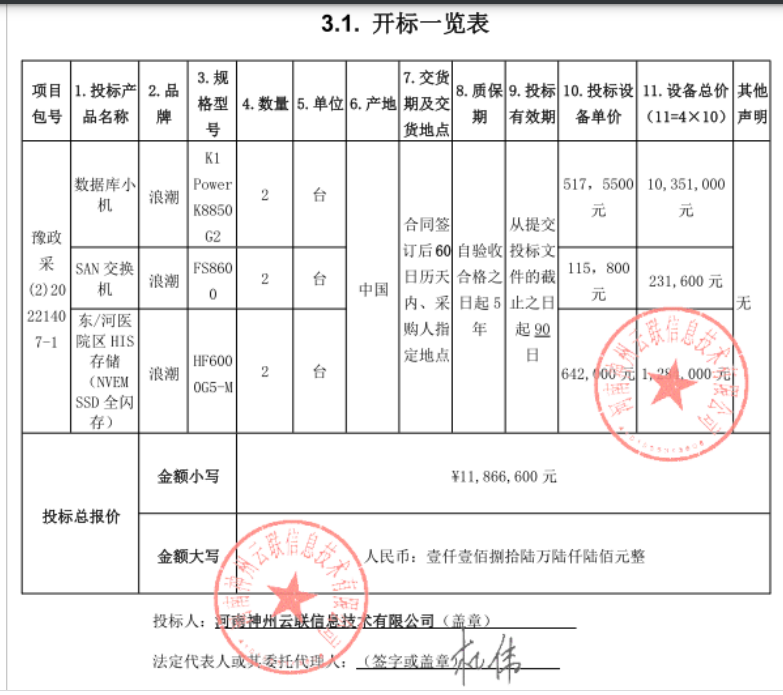 | 1)预算金额:人民币12660000.00元 最高限价:12660000.00元 序号 包号 包名称 包预算(元) 包最高限价(元) 1 豫政采(2)20221407-1 郑州大学第一附属医院数据库小机等项目 12660000.00 11881000.00 2)采购内容:本项目共1个包,包含数据库小机、SAN交换机、东/河医院区HIS存储(NVEM SSD全闪存)的采购、供货、运输、保险、装卸、安装、检测、调试、试运行、验收交付、培训、技术支持、软件升级、售后保修及相关伴随服务等。(详见采购文件) 3)交货期:合同签订后90日历天内;交货地点:采购人指定地点 4)合同履行期限:质保期结束。 | ||||||||||||