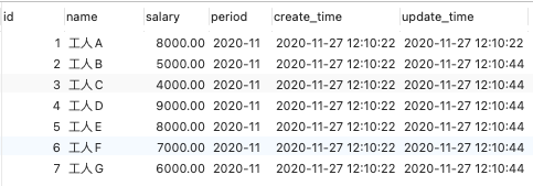 准备了7条数据进行测试,其中工人A和工人E薪水一样,都是8000元。