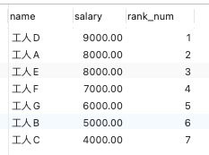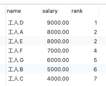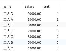 SELECTt.name,t.salary,t.rankFROM(SELECTname,salary,@num := @num +IF(@preScore = salary, 0, 1 ) `rank`,@preScore := salaryFROMsalary_rank,( SELECT @num := 0, @preScore := 0 ) tempORDER BYsalary DESC) t;